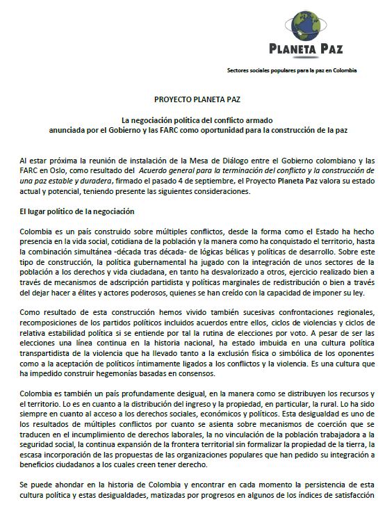 La negociación política del conflicto armado anunciada por el Gobierno y las FARC como oportunidad para la construcción de la paz