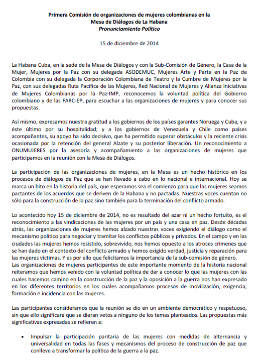 Pronunciamiento Político de la Primera Comisión de organizaciones de mujeres colombianas en la Mesa de Diálogos de La Habana
