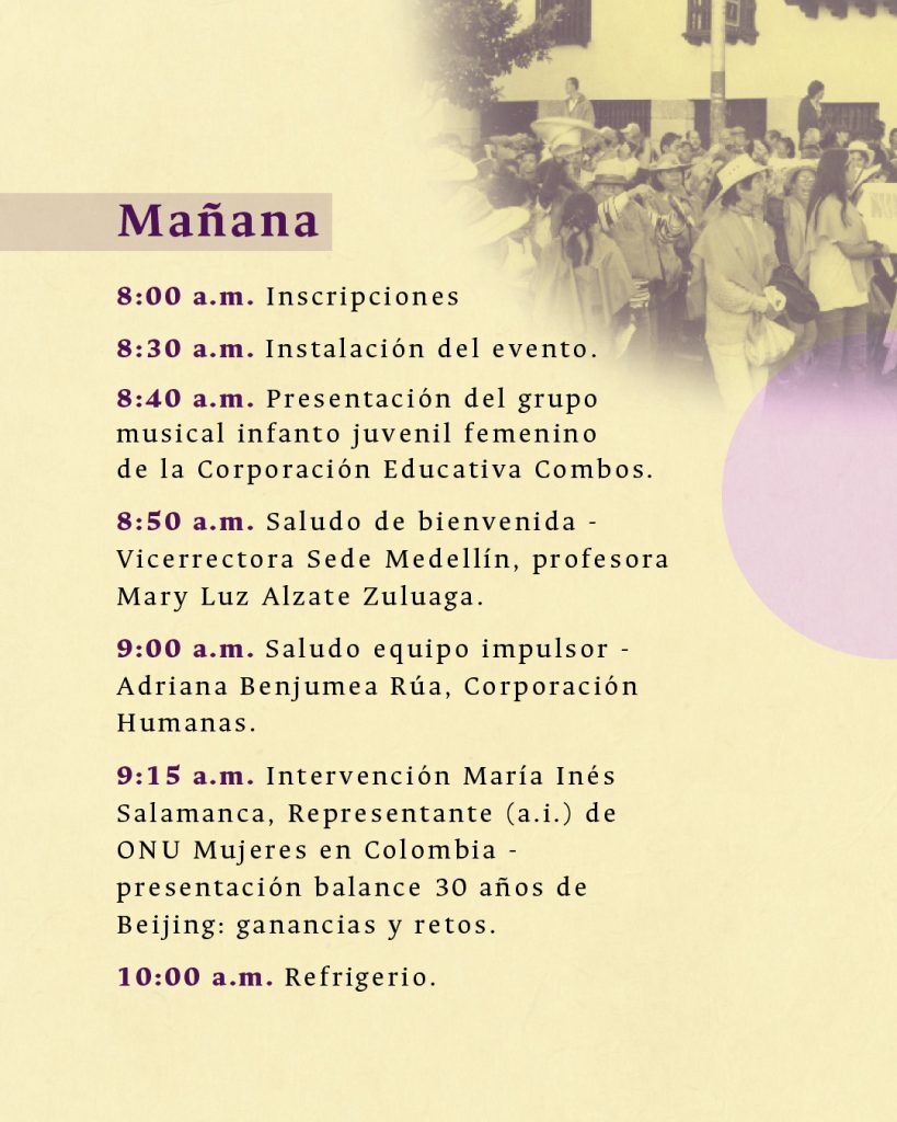 Medellín será la sede de un encuentro de feministas antioqueñas en un espacio convocado por organizaciones de mujeres para conmemorar y reconocer el trabajo realizado durante 30 años, desde la Conferencia Mundial de la Mujer realizada en Beijing del 4 al 15 de septiembre de 1995.