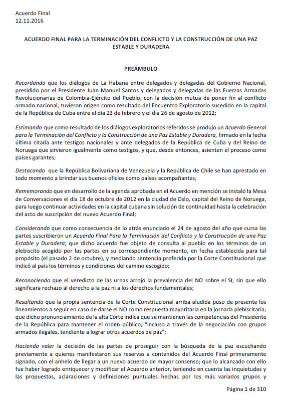 Acuerdo final para la terminación del conflicto y la construcción de una paz estable y duradera