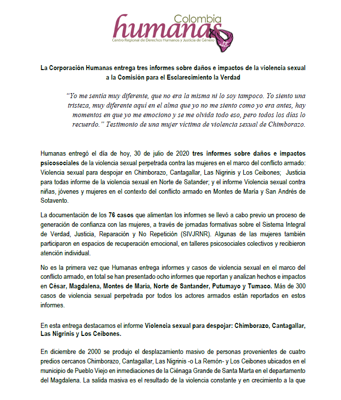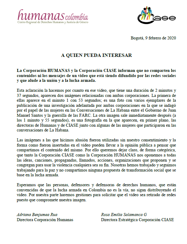 La línea de trabajo «Mujeres y construcción de paz» de la Corporación Humanas en Colombia se enfoca en incorporar una perspectiva feminista en las conversaciones de paz y en las políticas que tienen como objetivo consolidar la paz, e incidir para que se cumpla con las políticas que se han acordado o formulado, aportando o avanzando en una agenda de mujeres, paz y seguridad.