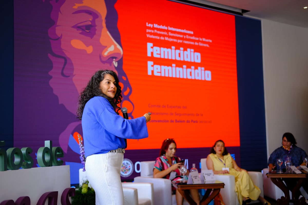 Luz Patricia Mejía, Secretaria Técnica del Mecanismo de Seguimiento de la Convención de Belém do Pará (MESECVI) presentó la Ley Modelo de Feminicidio como una herramienta para la región en la que destacó la integralidad en la prevención, protección, atención, investigación de los hechos y reparación estatal a víctimas y sobrevivientes.