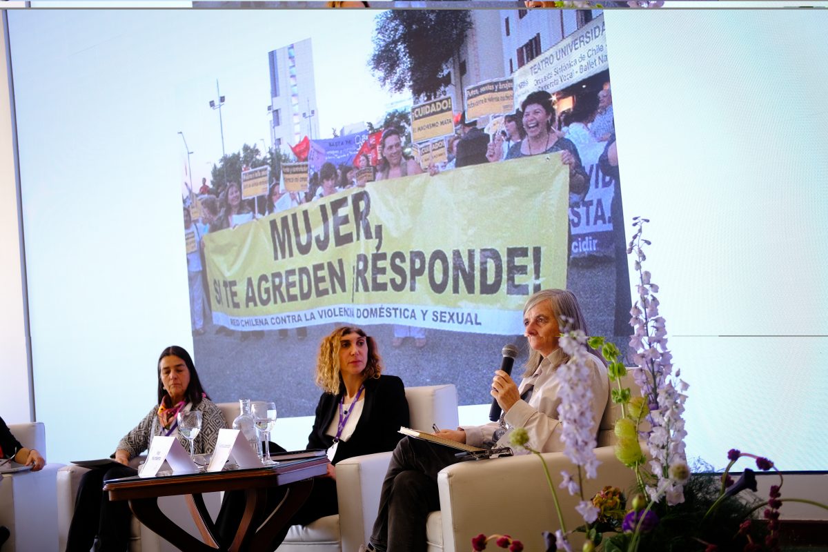 La fotógrafa Kena Lorenzini de Humanas Chile narró los orígenes del feminismo chileno durante la dictadura, la defensa de DDHH y cómo forjó su óptica como reportera gráfica. “Después de la pandemia, el fortalecimiento de la derecha y la violencia en las redes sociales, el feminismo en Chile ha entrado en un nuevo silencio con retroceso de derechos para las mujeres”, afirmó Kena en medio de su presentación.